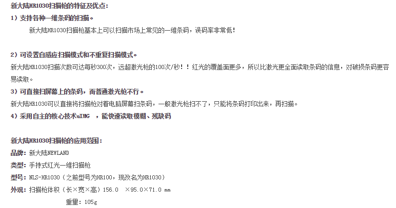 这款新大陆nls hr1030手持扫描枪扫描速度非常快,主要用于一维码的扫描,可满足绝大多数条码扫描的需要。可广泛应用于零售业,办公自动化等领域。高达300次/秒的扫描速度和超过30厘米的识读距离,使它成为手持条码扫描应用的不二选择。